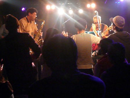 入念なマイクチェックの後「OUT OF BOUNDS」が登場、心地良いビートが刻まれ、ビートルズナンバーのアレンジもバッチリ決まって会心のステージ、やんややんやの大受けでした。PAも素晴らしい。
