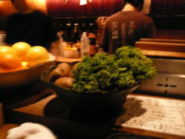 おでんとバリエーション豊富な串焼きで知られているようだが、店内で目を引くのはカウンターに並ぶ瑞々しい旬の野菜、なんでも店主の実家が農家で、畑からの獲れたてが運ばれてくるのだそうだ。これぞ京野菜だ。