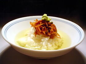 〆は、筍の姫皮を山椒の実と共に焚き上げたお茶漬け